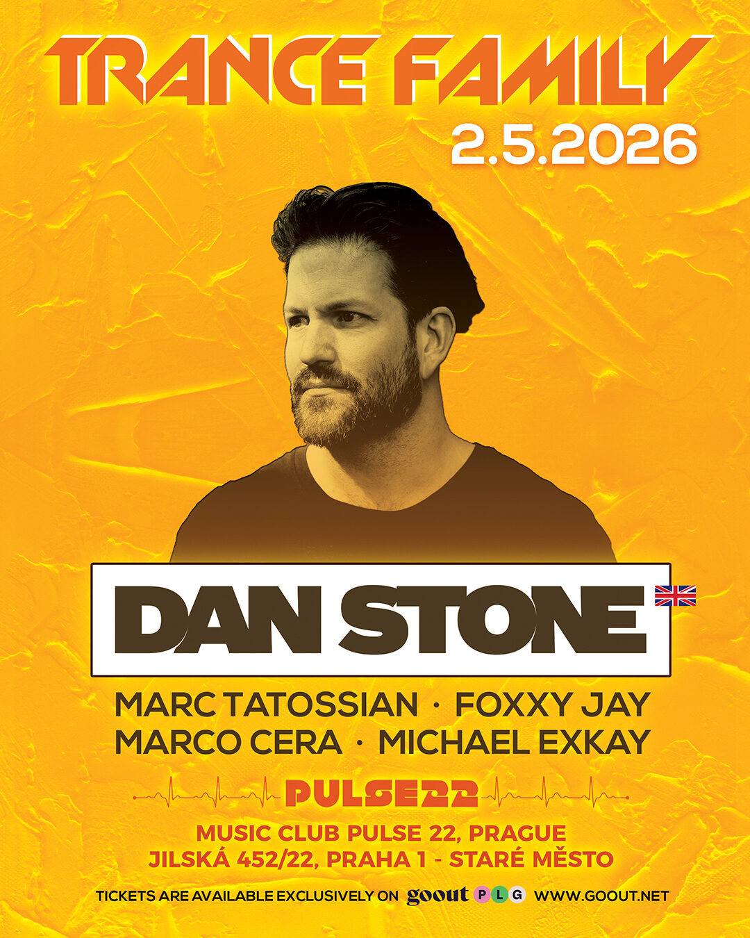 Dana lze často vidět hrát na některých z největších tranceových akcí po celém světě, mezi které patří například Dreamstate, FSOE 400 v Buenos Aires před 10 000 lidmi, Hollywood Palladium, Karnak Temples v Egyptě, Tomorrowland, Creamfields, Ministry Of Sound, dvě vystoupení na ASOT festivalu a ani letos nebude chybět na věhlasném Luminosity festivalu. A když Dan nevystupuje, věnuje se své práci ve studiu, pečlivě vybírá remixy pro některé z nejlepších DJů a producentů na světě a pracuje na dalších originálních skladbách pro svou věrnou a neustále rostoucí fanouškovskou základnu. A my jsme rádi, že tento světový producent přijal pozvání a zahraje pro českou Trance Family speciální tříhodinouvý set během komorní noci v útulném hudebním klubu Pulse 22. O domácí support se postarají rezidentní DJ eventu Trance Family Marc Tatossian, čerstvá vítězka Czech Trance Awards Foxxy Jay, zkušený hostující DJ z Německa Marco Cera a svou premiéru v Pulse 22 si odbude brněnský Michael Exkay.